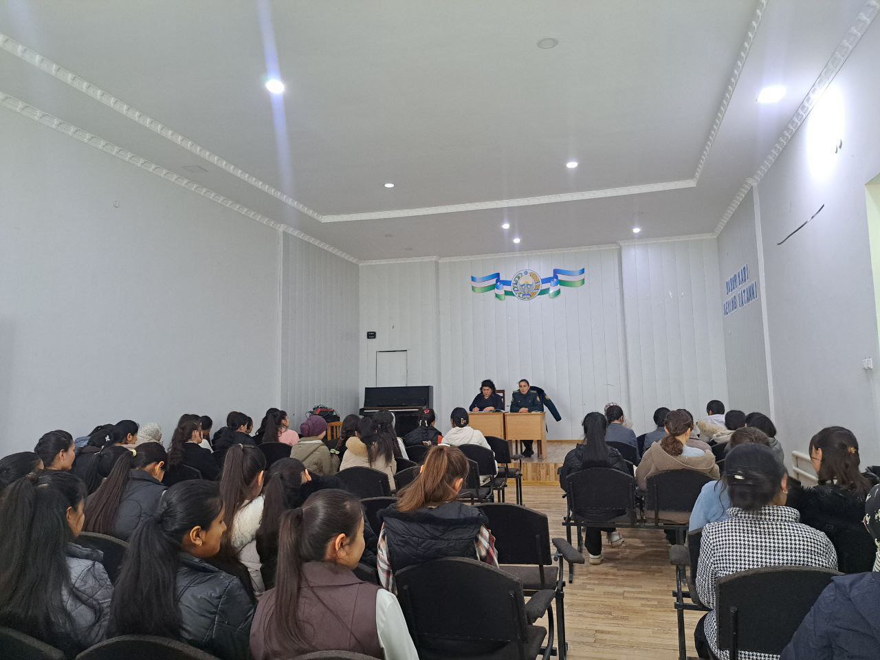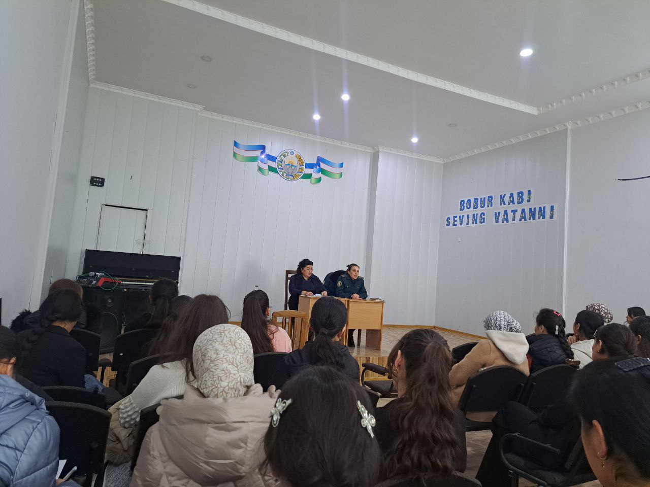 SamDCHTI akademik litseyida Samarqand shahar IIOFMB 3-sonli IIB XPB xotin qizlar masalalari bo‘yicha inspektori leytenant X.Ne‘matova hamda xotin qizlar raisasi U.Mamatjonova ishtirokida o‘quvchilar o‘rtasida “Ayollar jinoyatchiligining” oldini olish, giyohvandlik vositalari, psixotrop moddalar va kuchli ta’sir qiluvchi preparatlarning suiiste’moli, uning noqonuniy aylanishini oldini olishga qaratilgan davra suhbati tadbiri o‘tkazildi.