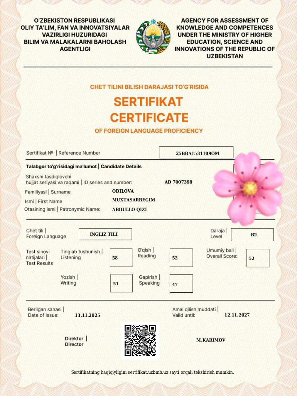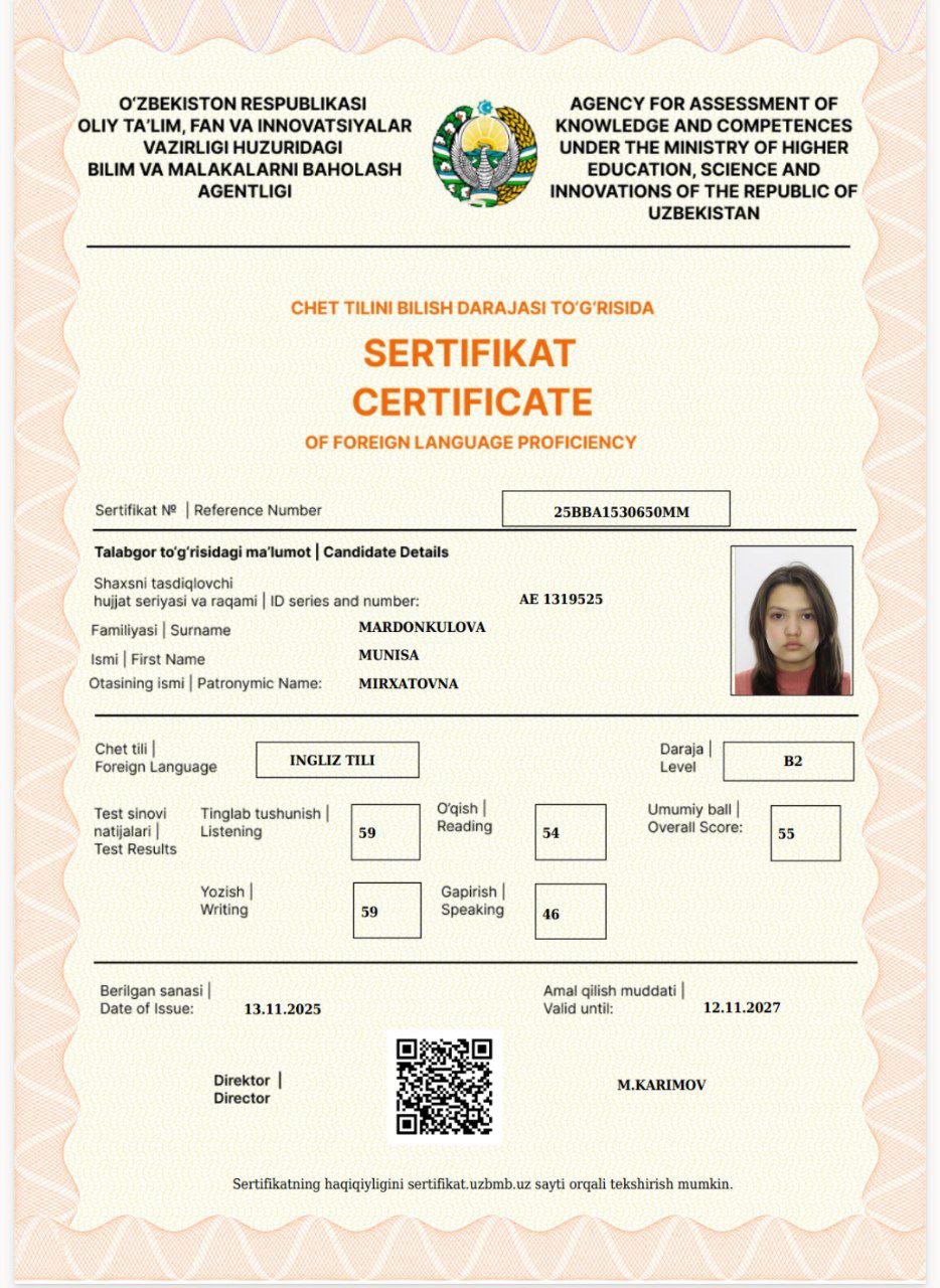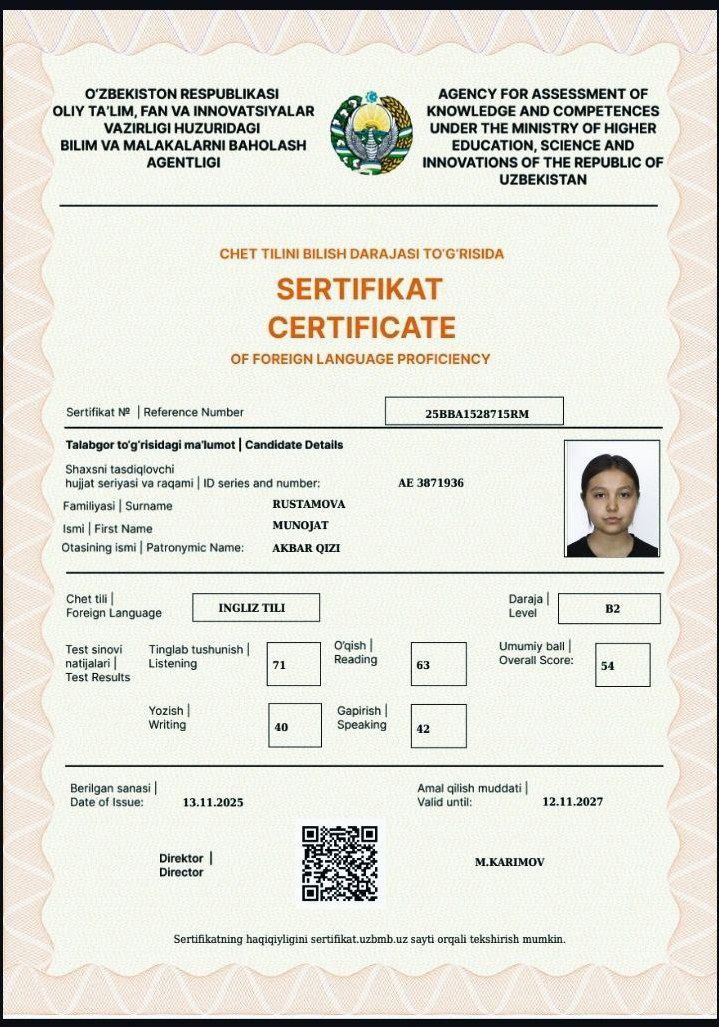 Joriy yilning 18-19-oktabr kunlari boʻlib oʻtgan Ingiliz tili CEFR imtihoni natijalariga koʻra Litseyimizning bir guruh iqtidorli o‘quvchilari Ingliz tili fanidan B2 va undan yuqori darajadagi sertifikatni muvaffaqiyatli qo‘lga kiritdi!