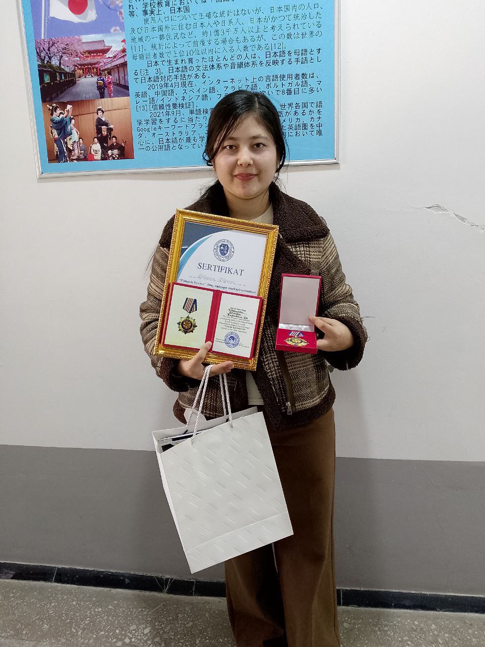 “Yuksak ilm fidoyisi” estalik nishoni, maxsus guvohnoma va sertifikat bilan taqdirlandi.