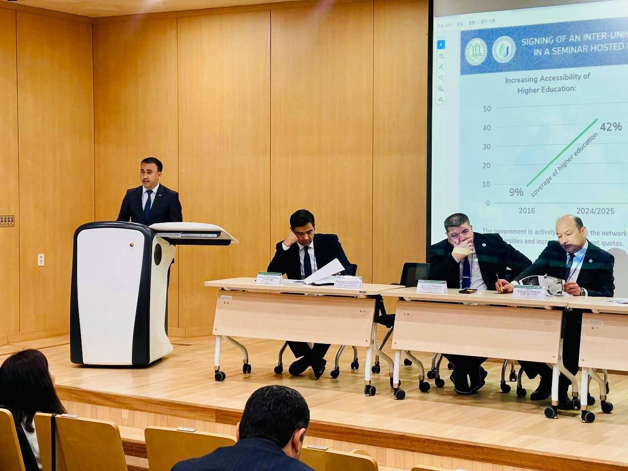 Tashrifning navbatdagi muhim manzili Jeju Milliy Universiteti bo‘lib, universitet prezidenti, prorektorlari va Xalqaro aloqalar bo‘limi rahbariyati bilan uchrashuv davomida qo‘shma ta’lim dasturlari (2+2, 3+1), ilmiy-tadqiqot loyihalari, professor-o‘qituvchilar almashinuvi, talabalar uchun grant va stipendiya imkoniyatlari, shuningdek, xalqaro konferensiyalarni birgalikda tashkil etish kabi yo‘nalishlar atroflicha muhokama qilindi. Shundan so’ng, delegatsiya Jeju Provincial Council raisi va kengash a’zolari bilan uchrashib, O‘zbekiston–Koreya aloqalarini ta’lim, madaniyat, yoshlar diplomatiyasi va parlamentlararo hamkorlik doirasida yanada kengaytirish, Jejuda o‘zbekistonlik yoshlar uchun qo‘shimcha imkoniyatlar yaratish masalalarini muhokama qildi. Tashrif davomida Sanbangsan, Yongmeori Coast, Sagye Coast kabi tarixiy-madaniy maskanlar, shuningdek, Jejuning ekologik turizm infratuzilmasi bilan ham tanishuv tashkil etildi.
