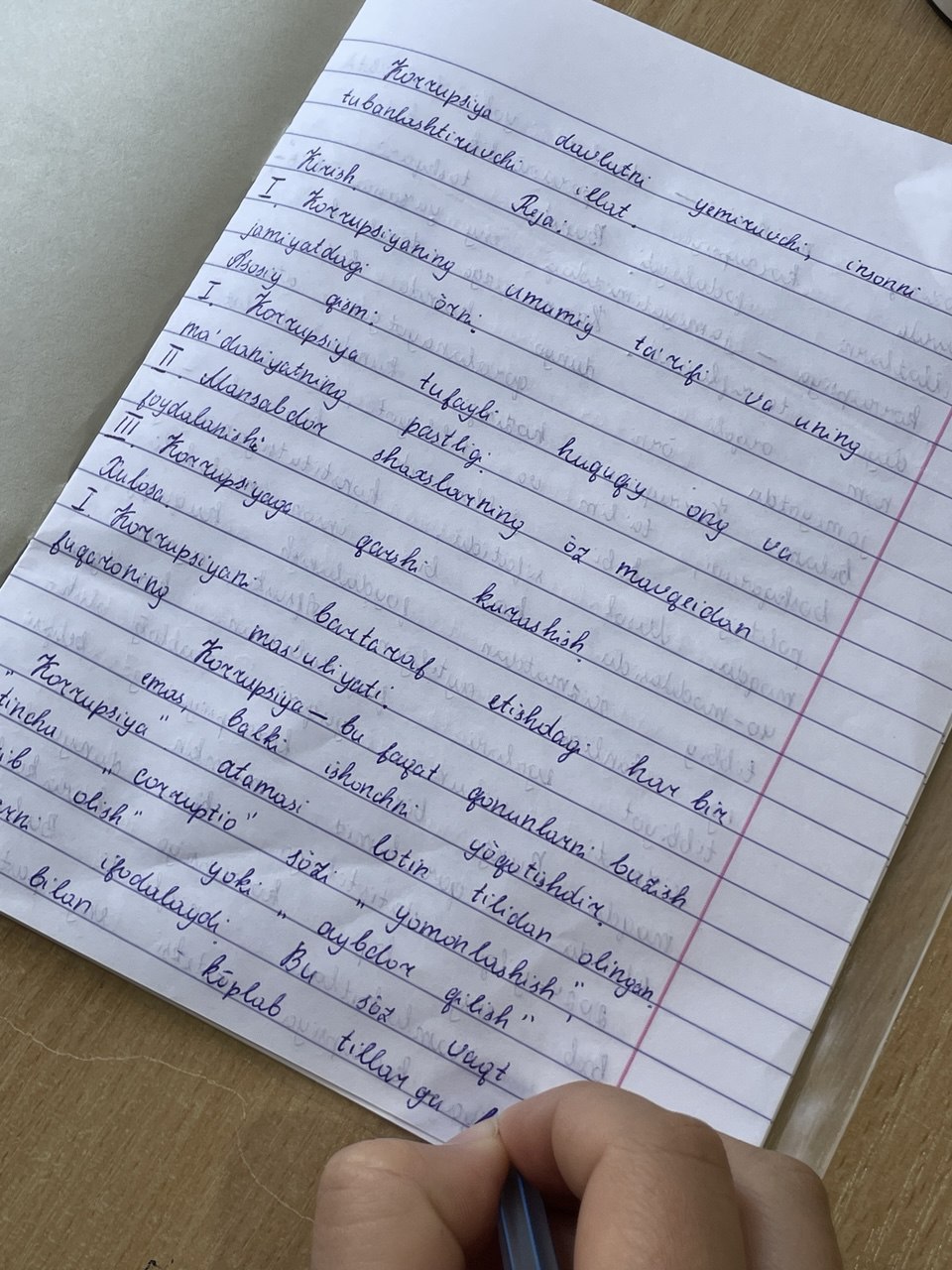 Ushbu tadbirda o'quvchilar “Korrupsiya jamiyat kushandasi” mavzusiga doir bilimlarini o'zlarining chizgan rasmlari va yozgan insholarida namoyon etdilar.