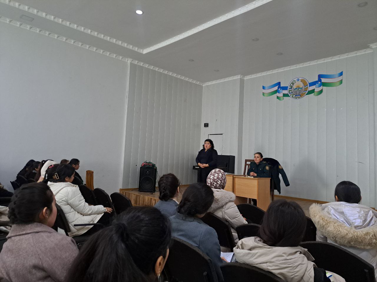 SamDCHTI akademik litseyida Samarqand shahar IIOFMB 3-sonli IIB XPB xotin qizlar masalalari bo‘yicha inspektori leytenant X.Ne‘matova hamda xotin qizlar raisasi U.Mamatjonova ishtirokida o‘quvchilar o‘rtasida “Ayollar jinoyatchiligining” oldini olish, giyohvandlik vositalari, psixotrop moddalar va kuchli ta’sir qiluvchi preparatlarning suiiste’moli, uning noqonuniy aylanishini oldini olishga qaratilgan davra suhbati tadbiri o‘tkazildi.