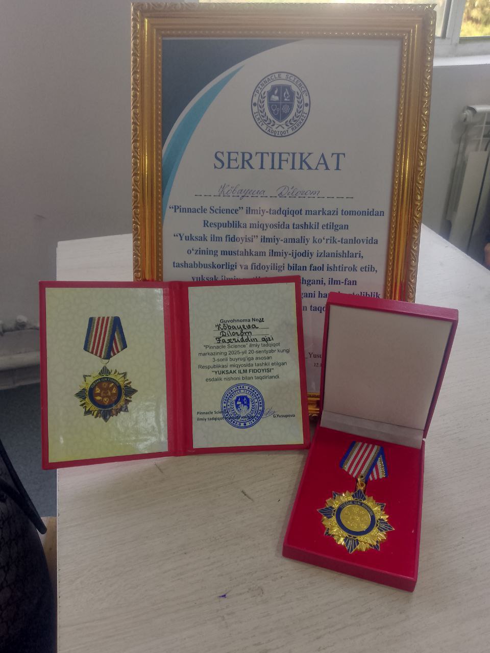 “Yuksak ilm fidoyisi” estalik nishoni, maxsus guvohnoma va sertifikat bilan taqdirlandi.